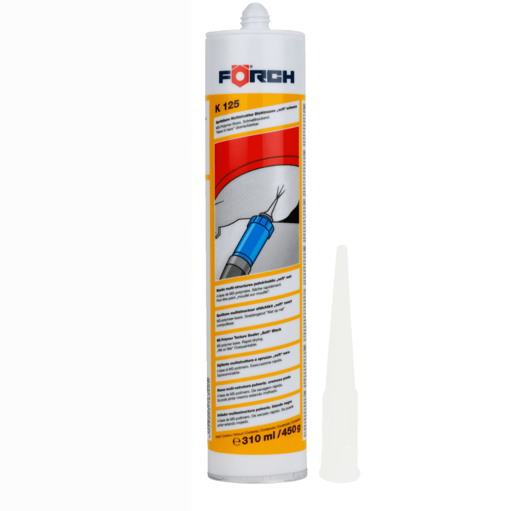 FORCH K125 natryskowa masa uszczelniająca czarna 310 ml to elastyczna, jednokomponentowa masa uszczelniająca o strukturze „soft”, idealna do natrysku i wypełniania szerokich spoin w karoseriach i konstrukcjach stalowych. Zapewnia świetną adhezję, możliwość lakierowania bez obróbki nawet przez 5 dni, oraz odporność na warunki atmosferyczne i UV. Bez silikonu czy izocyjanianu — bezpieczna i wydajna.