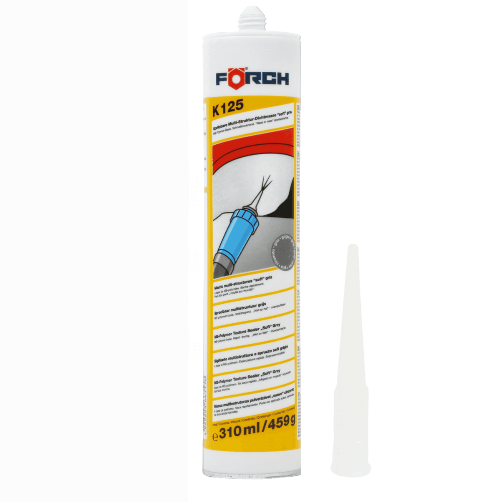 FORCH K125 natryskowa masa uszczelniająca, szara (310 ml) – jednokomponentowa masa typu „soft-structure”, idealna do uszczelniania szerokich spoin i rekonstrukcji faktury powierzchni w karoserii. Może być natryskiwana lub nakładana pędzlem, od razu gotowa do lakierowania „na mokro” nawet przez 5 dni. Odporna na UV, niekurczliwa, bez silikonu i izocyjanianów. Świetnie sprawdza się w nadkolach, komorze silnika i bagażniku.