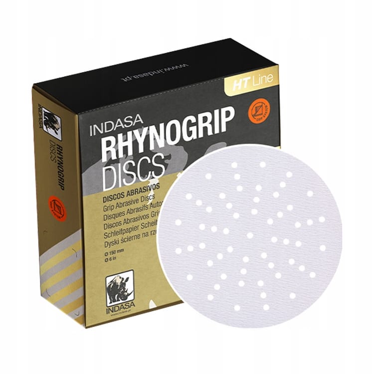 Indasa Rhynogrip HT Line P800 150 mm [57H] – wysokiej jakości krążek ścierny na rzep, idealny do matowania i precyzyjnego wykańczania powierzchni w lakiernictwie i motoryzacji. Otworowanie 57H zapewnia doskonałe odprowadzanie pyłu i dłuższą żywotność.