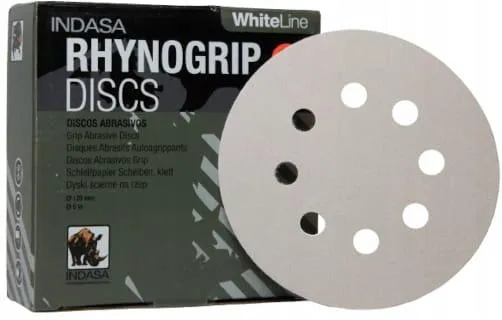 Krążek ścierny Indasa Rhynogrip White Line P280, 125 mm, 8H – uniwersalny, na rzep, do szlifowania lakierów, podkładów, drewna, metalu i tworzyw sztucznych.