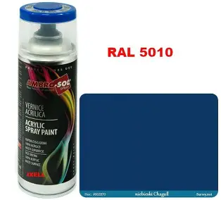 Lakier akrylowy w sprayu Ambro-Sol RAL 5010 Połysk – intensywny niebieski gentian, szybkoschnący, o wysokiej odporności na warunki atmosferyczne i UV. Idealny do metalu, drewna, szkła i plastiku (po zagruntowaniu). Pojemność 400 ml.