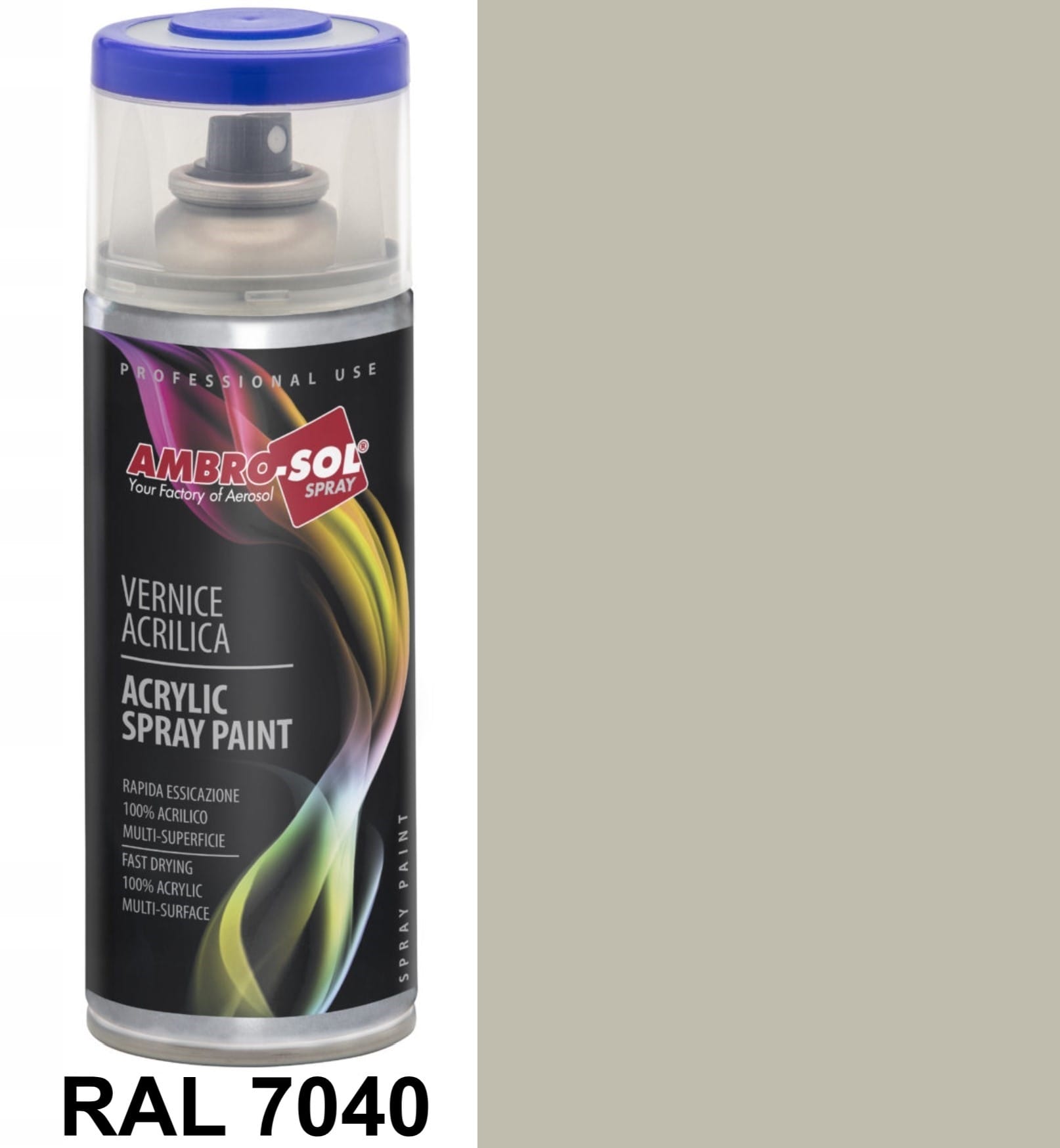 Lakier akrylowy w sprayu Ambro-Sol RAL 7040 połysk (Szary okienny), 400 ml – szybkoschnący, odporny na warunki atmosferyczne, idealny do metalu, drewna i plastiku.