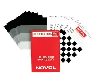 NOVOL Test Krycia – karta do natrysków próbnych (50 szt.), format 205 × 140 mm, dwustronna: szachownica + gradient szarości. Umożliwia ocenę siły krycia i wpływu podłoża na kolor, kompatybilna z lakierami wodorozcieńczalnymi i rozcieńczalnikowymi.